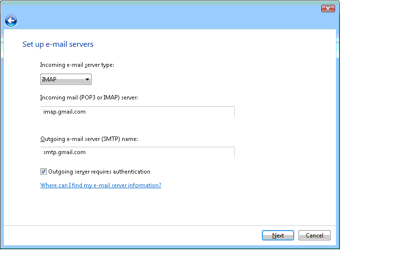 4) Choose IMAP input given servers, and check 'Outgoing server requires authentication'; click Next. 5) Input the following for the incoming and outgoing servers: